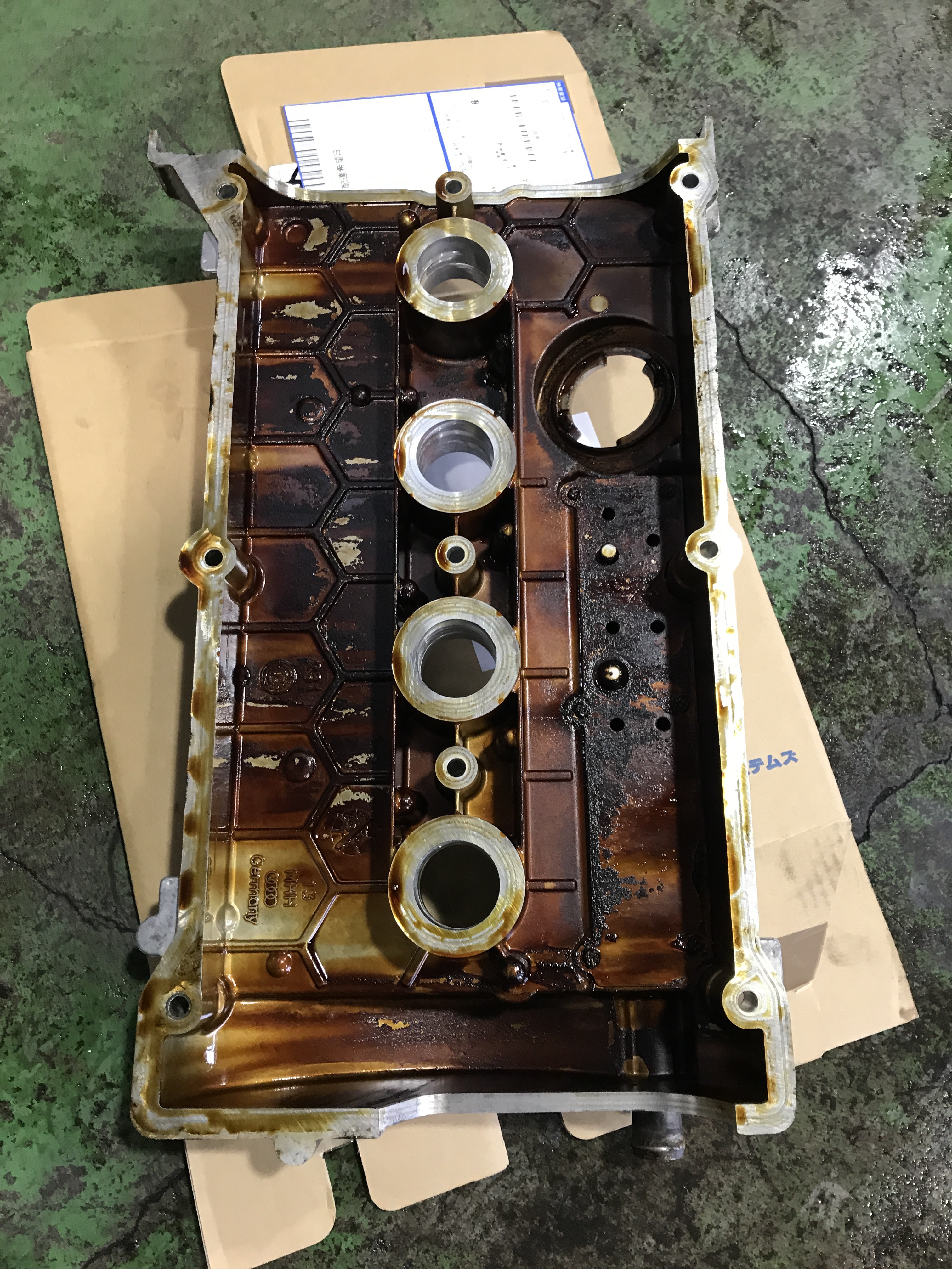 エンジンのタペットカバーのパッキンが硬化してオイル漏れをしていました。