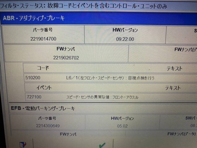 診断機を当てるとホイールスピードセンサーの故障コードが多数出ました