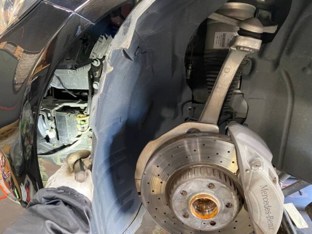 リフトアップ後タイヤを外して作業していきます