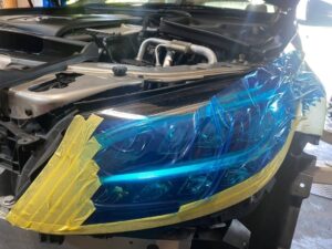 ヘッドライトとフェンダーをマスキングテープで養生します