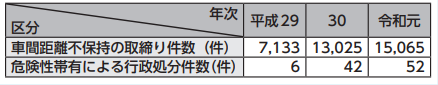 車間距離不保持の取締り件数等の推移(平成29~令和元年)