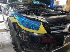 マスキングテープでフェンダーとヘッドライトを養生