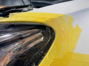 フェンダーとヘッドライトをマスキングテープで養生します