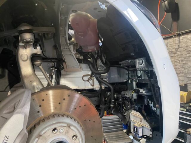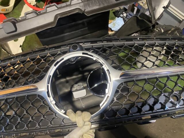 純正グリルやベンツマークなどを外していきます