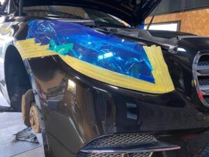 ヘッドライトとフェンダーをマスキングテープで養生します