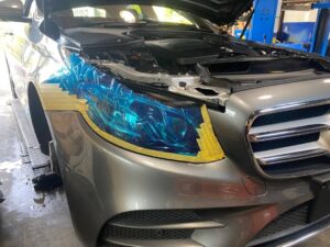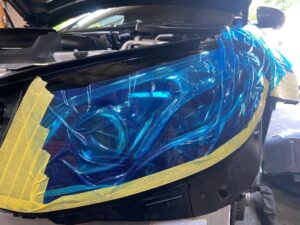 ヘッドライトとフェンダーをマスキングテープで養生して