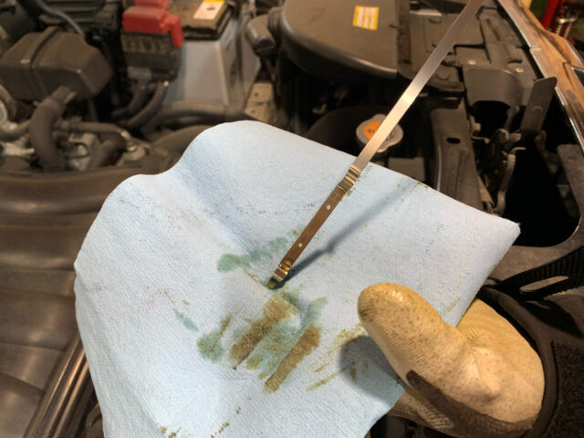 まずオイルレベルゲージを引き抜き、拭き取ります