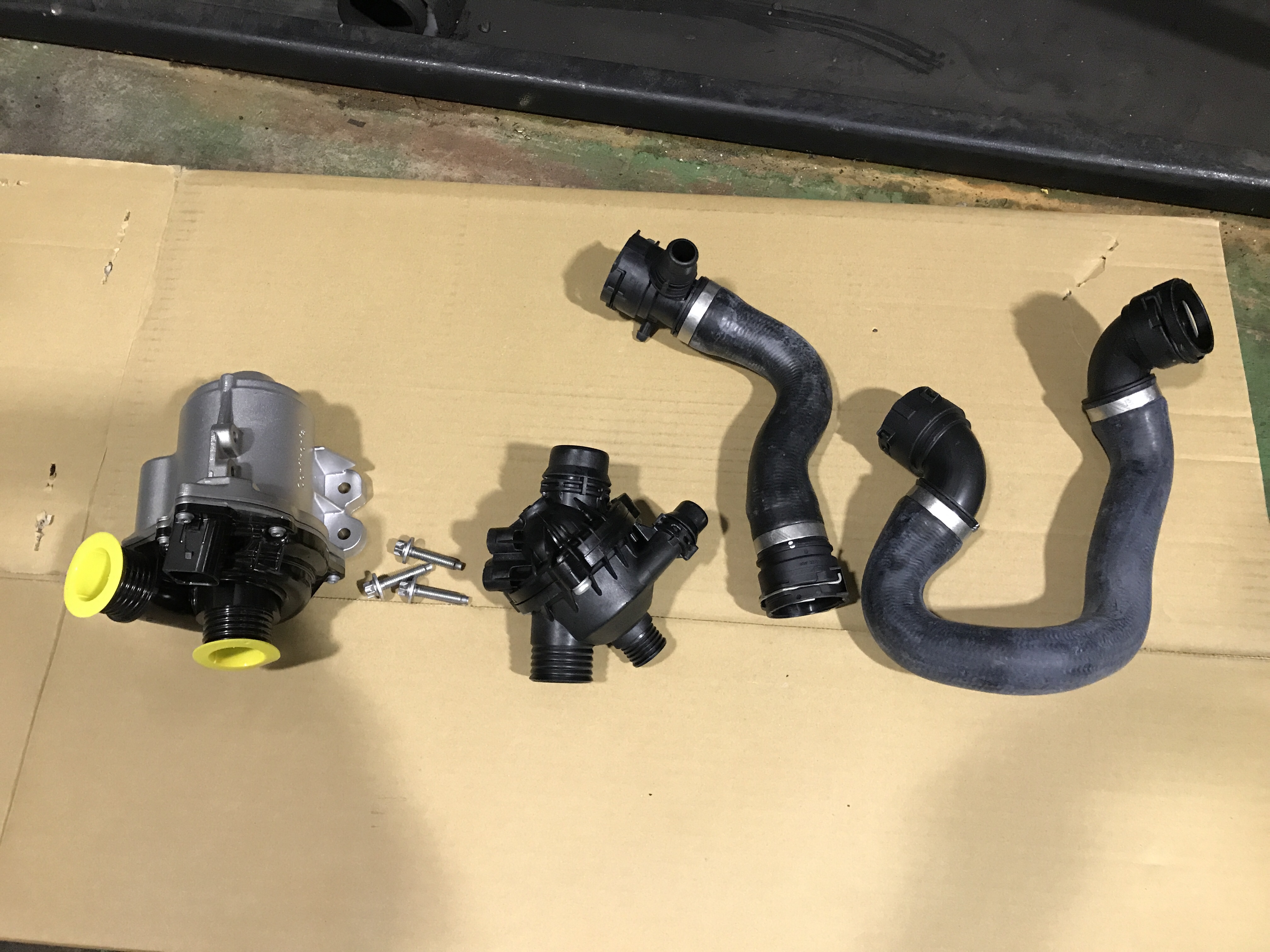 BMWのE92型の3シリーズのクーペがオーバーヒートにて入庫のため、修理させて頂きました。 現状を確認したところ、電動ウォーターポンプが動いていませんでした。 ホース類も確認したところ、アッパーホースとロアホースに滲みがありました。 電動ウォーターポンプを外すにあたり、サーモスタットも外すのでこちらも提案させて頂きました。 電動ウォーターポンプを固定しているアルミボルトは再使用不可のため、ボルトも同時交換です。 周りを外してスペースを確保して、部品を交換していきます。 最後にクーラントを入れてエア抜きをして、加圧して漏れがない事確認して作業完了になります。 要交換部品と交換オススメ部品をお客様のご要望に合わせて選ばせて頂きます。 この度はオーバーヒート修理のご依頼ありがとうございました。 BMWのオーバーヒートの修理のご依頼お待ちしております。
