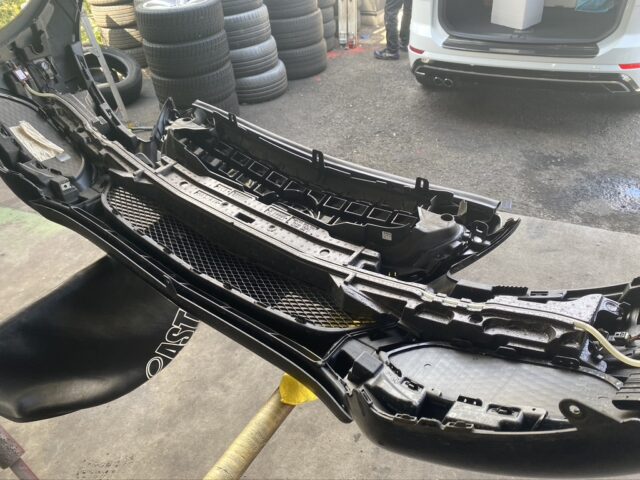 新しいグリルをバンパーに取り付け、諸々の部品を移植したらバンパー取付