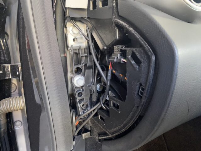 フロントカメラと接続し、今度は助手席側のカバーの中に配線を隠します。
