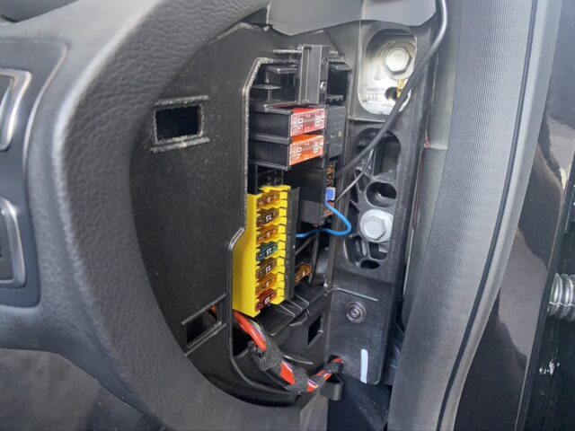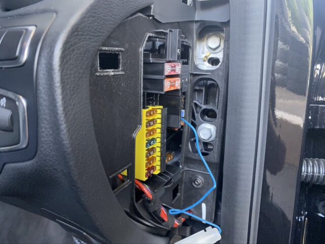 W205前期の場合は運転席横のカバーを開けた中にあるヒューズボックスからACC電源を取ります。