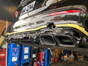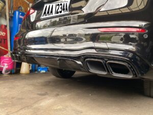 リアのディフューザーとマフラーカッターを交換しました。元のパーツを外し、新しいパーツを取り付け、最終的な調整を行いました。