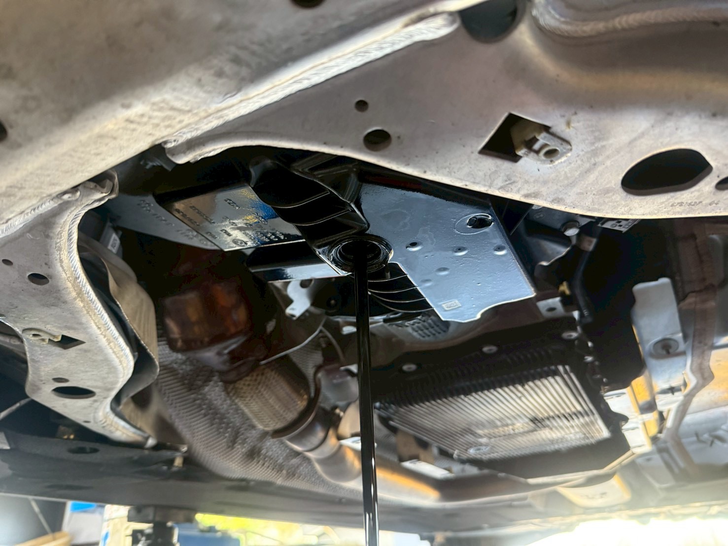 その後、エンジンマウント接続部を外してエンジン本体を持ち上げます。その状態でオイルパンのボルトを外しますが、エンジンマウントのフレームが被っているので、ツール等を使って避けながら作業してオイルパンを外します。
