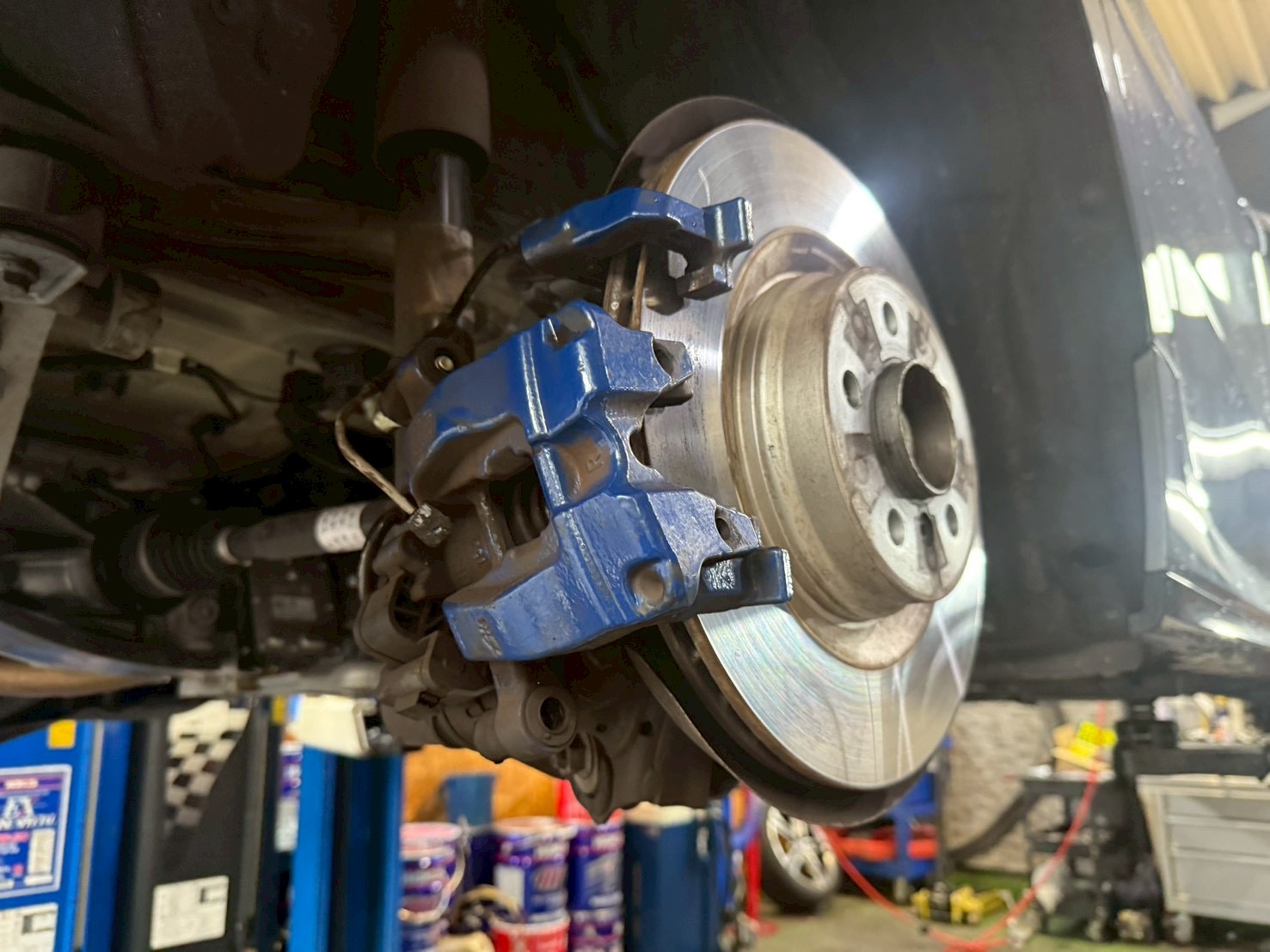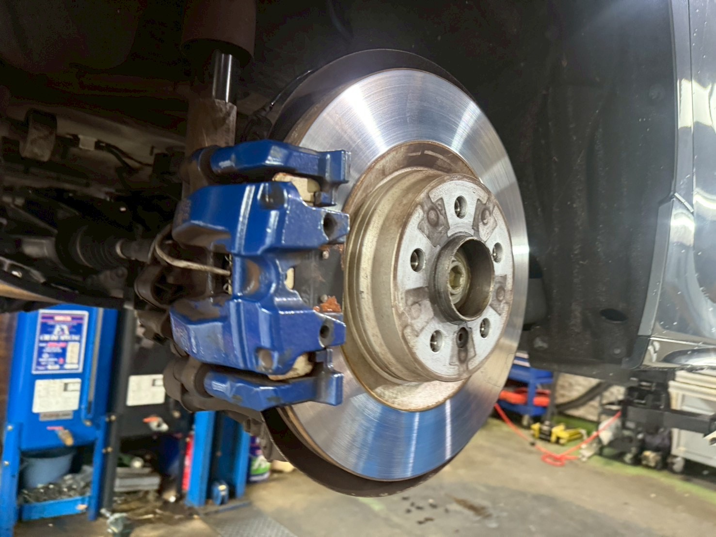 リアが電動パーキングブレーキなので、まずは診断機を接続してサービスモードへ切り替えます。ブレーキパッド交換モードになったらタイヤを4つ外していきます。