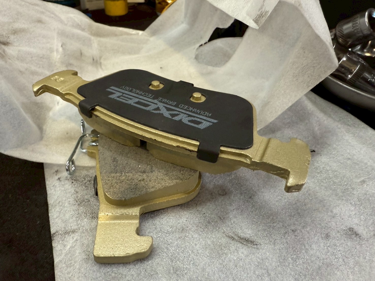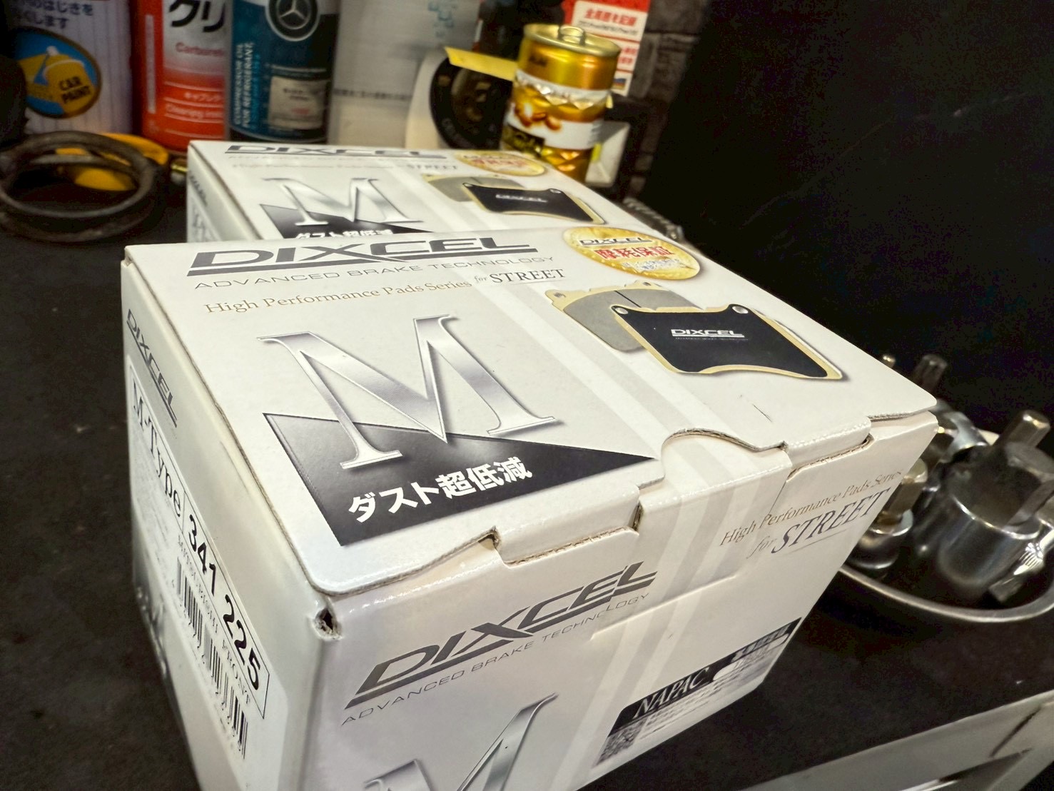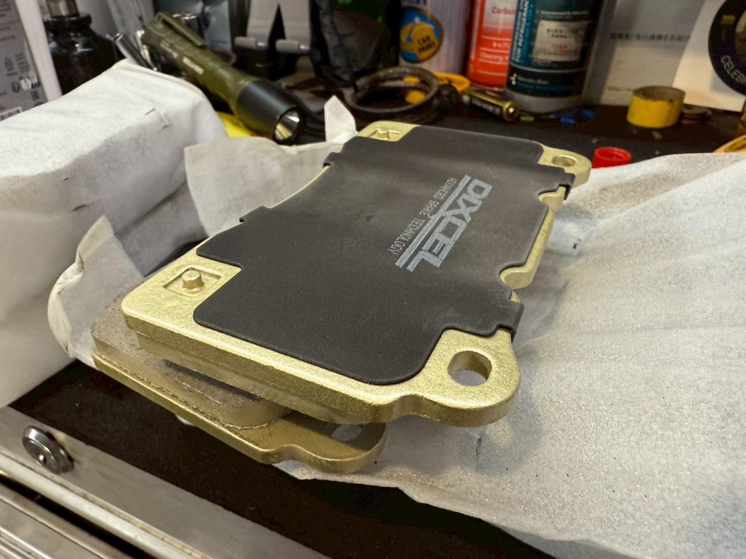 持ち込みしていただいたDIXCELの低ダストブレーキパッドを取り付けます。