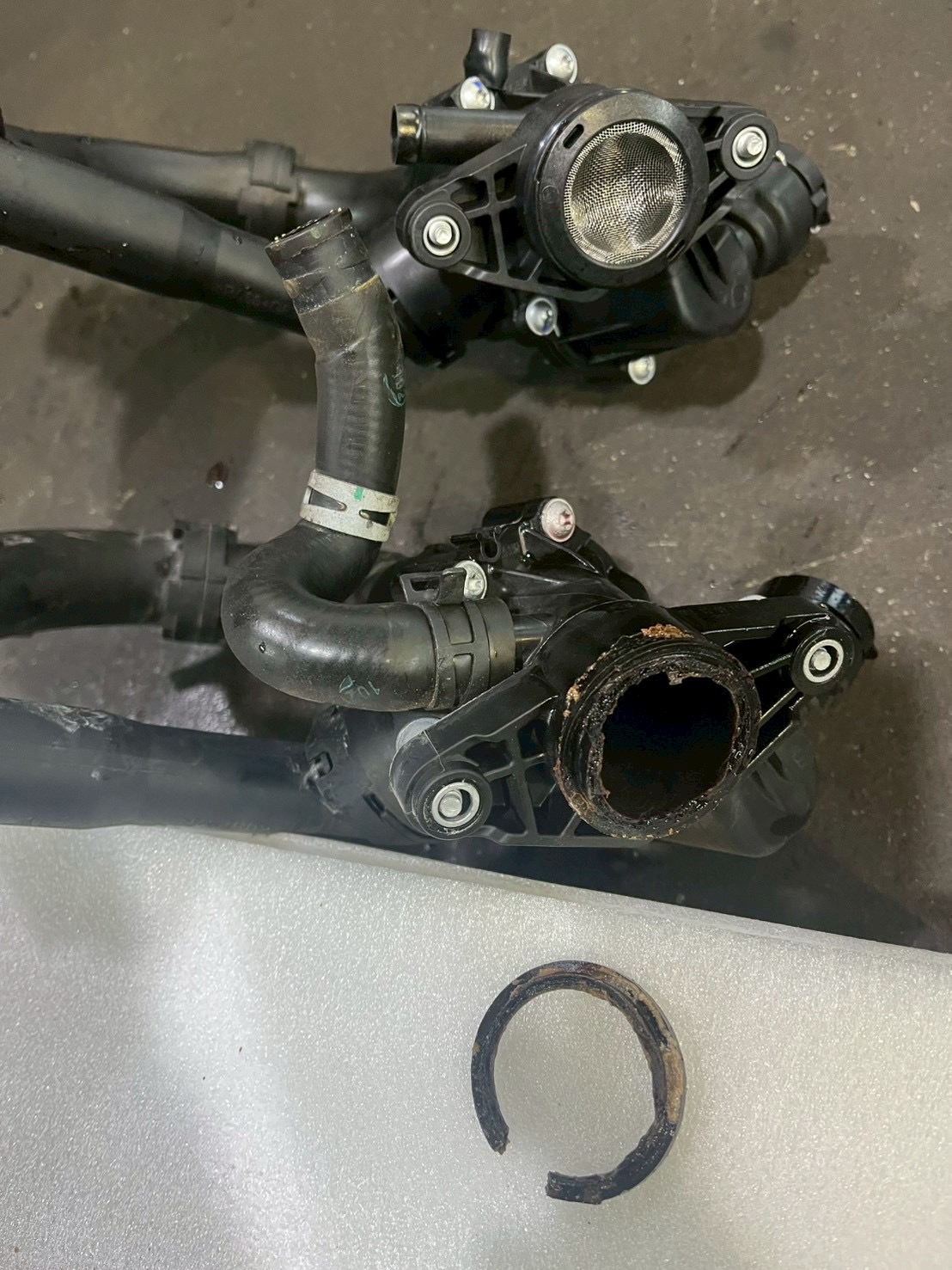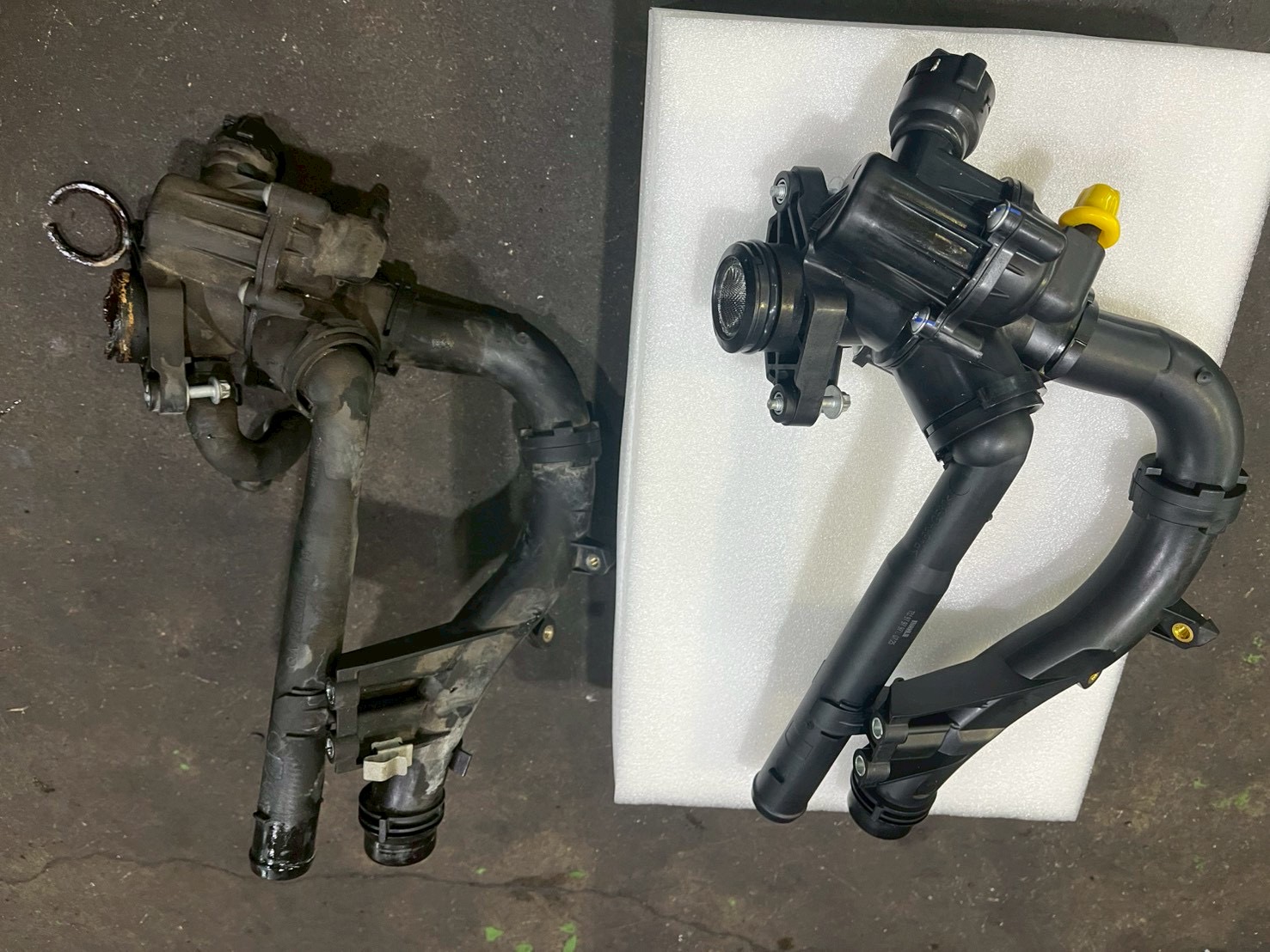 新旧を比較すると接合部が劣化していることがわかります。これで水漏れの心配はありません。元通りに組み付けて、クーラントを補充して完了です。