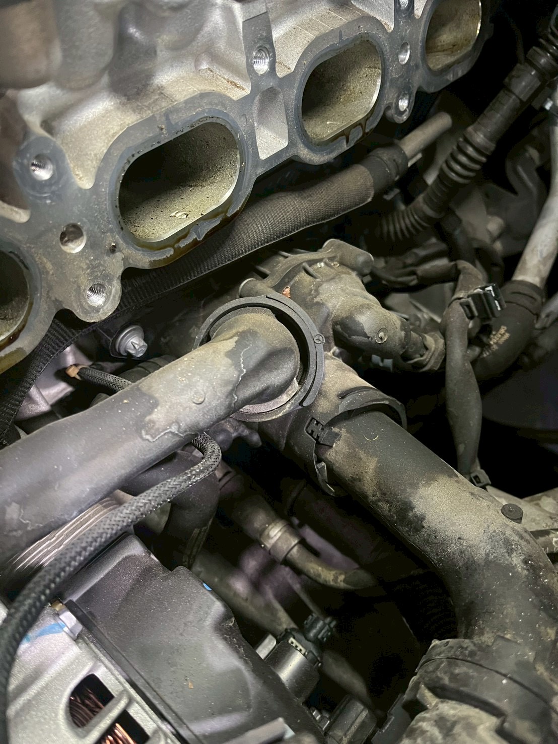 インタークーラーやインテークマニホールド等を外すとサーモスタットが見えます。