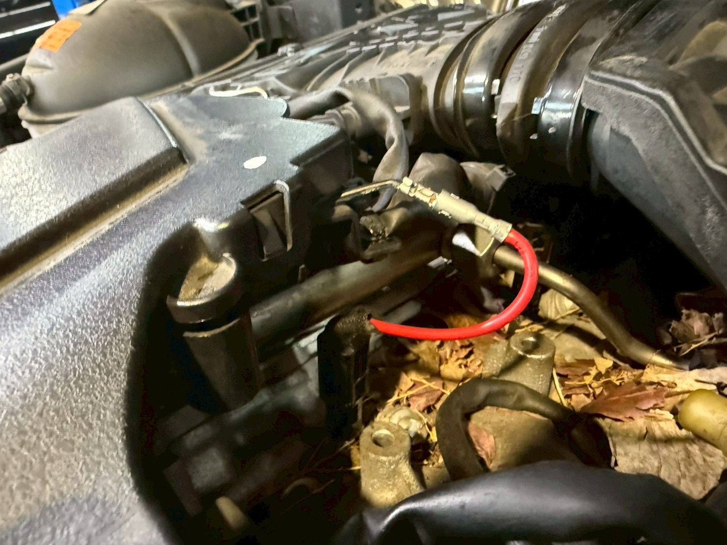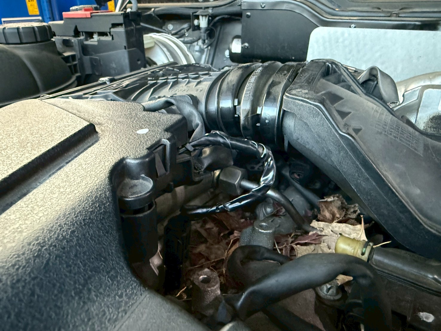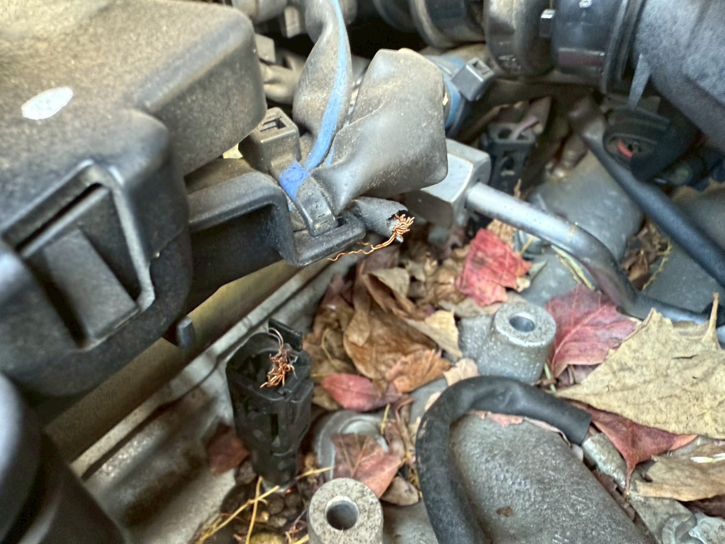 実際にエンジンルーム内を確認するとネズミが侵入した形跡があり、配線がかじられています。