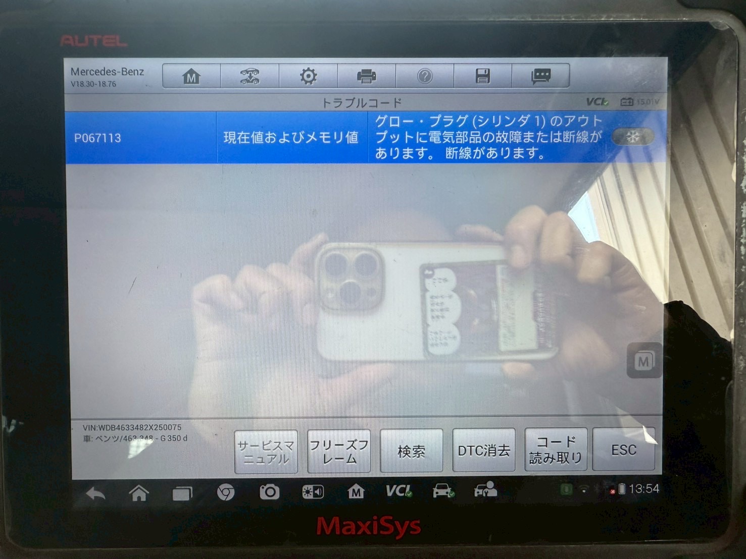 診断機に繋ぐと「グロー・プラグ(シリンダ1)のアウトプットに電気部品の故障または断線があります。」と表示されます。