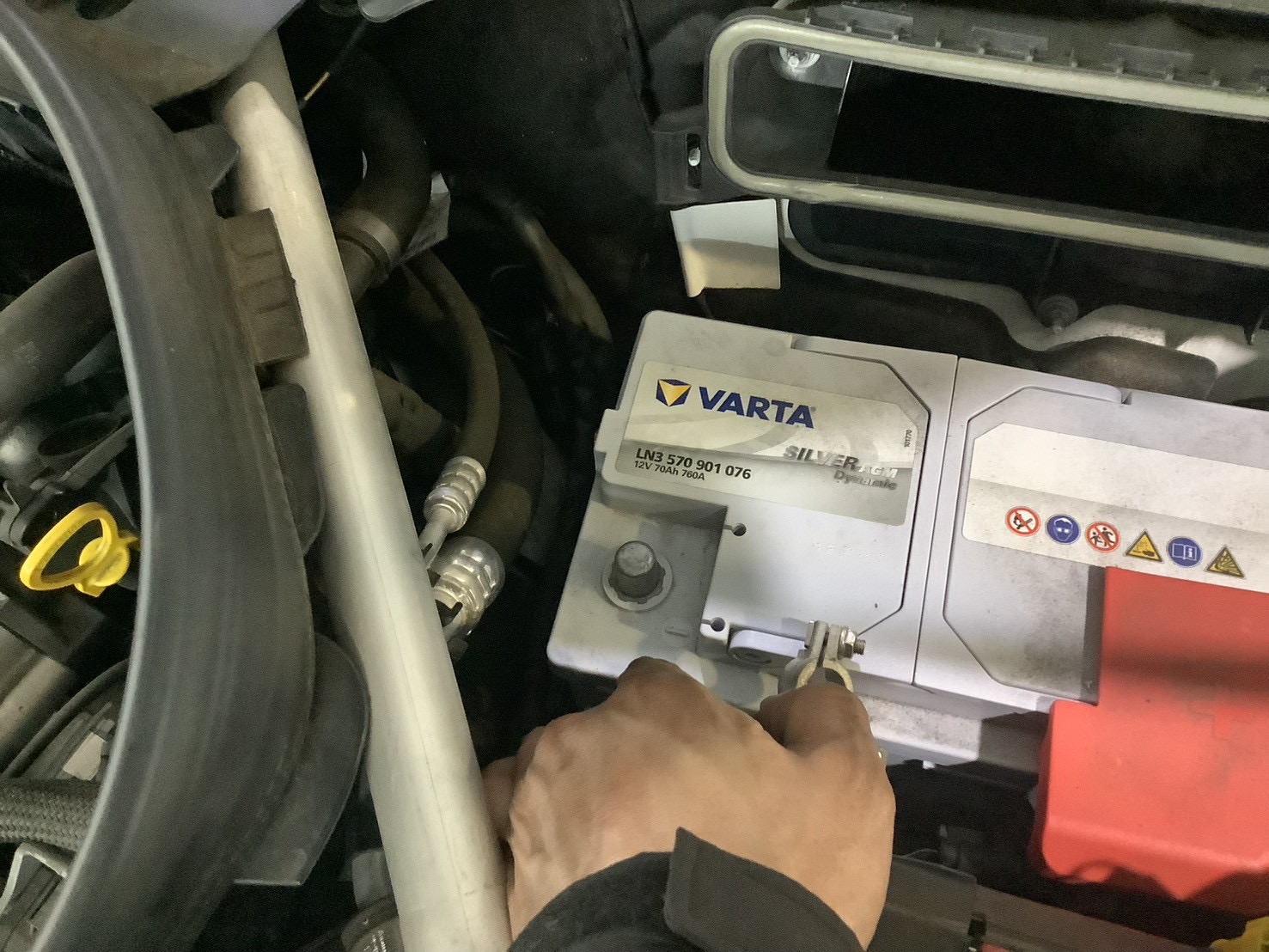オルタネーターを外すので、まずはバッテリーのマイナスターミナルを外します。バッテリーの端子を外さずにオルタネーターの交換作業を行うと、ショートする可能性があるので注意してください。