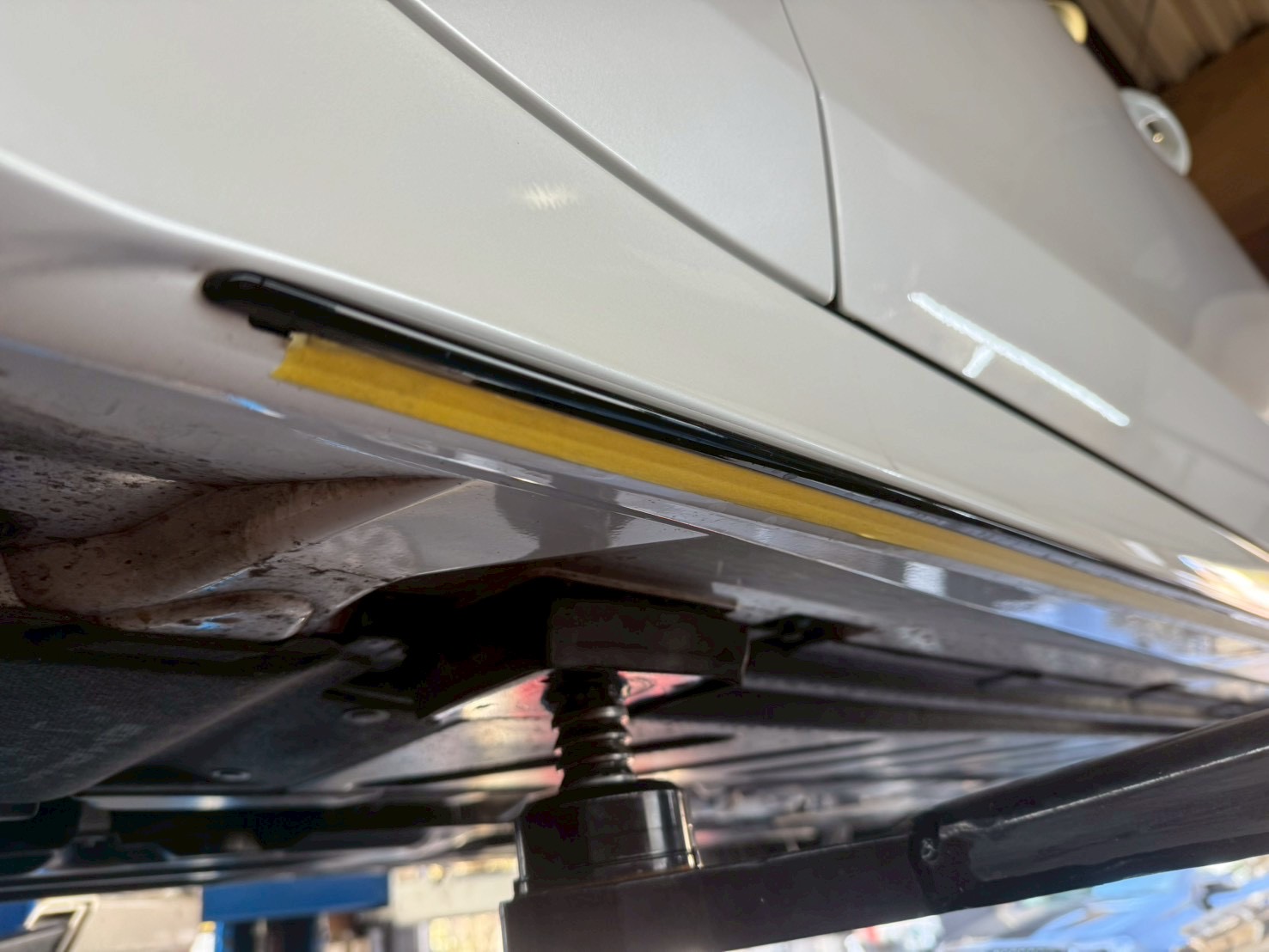 サイドスカートパネルもカーボンに塗装するとのことで取り外しを依頼していただきました。爪で引っかかっていますが、その他の部分は両面テープで頑丈に取り付けられています。