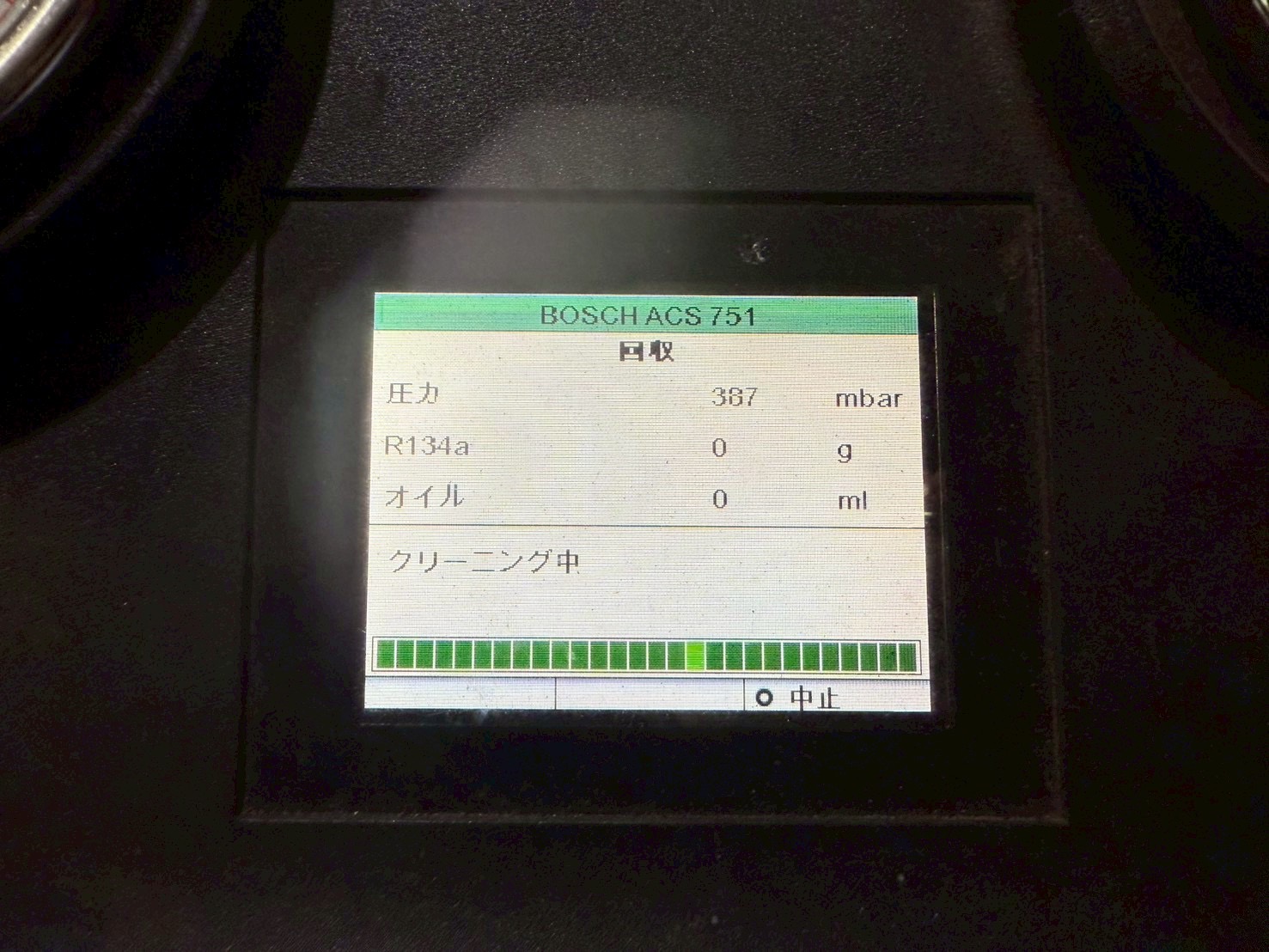 エアコンガスとオイルを回収し、真空引きをして水分やゴミなどの不純物を取り除きます。