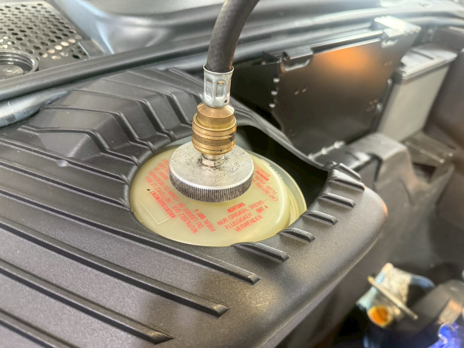 ブレーキオイルチェンジャーによって圧送でオイルを抜いて、新しいオイルを充填します。