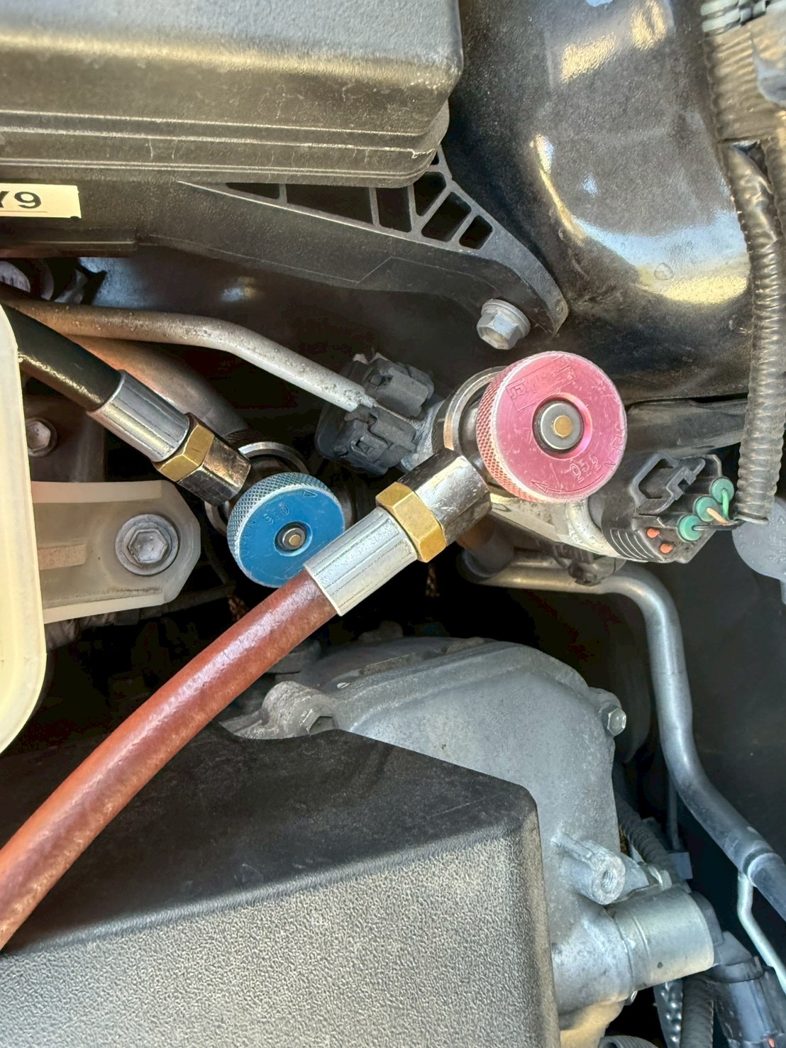 元の状態でもそこまで悪くはありませんが、エアコンガスクリーニングでさらに改善していきます。それではエアコンガス配管にエアコンガスクリーナーを繋ぎます。