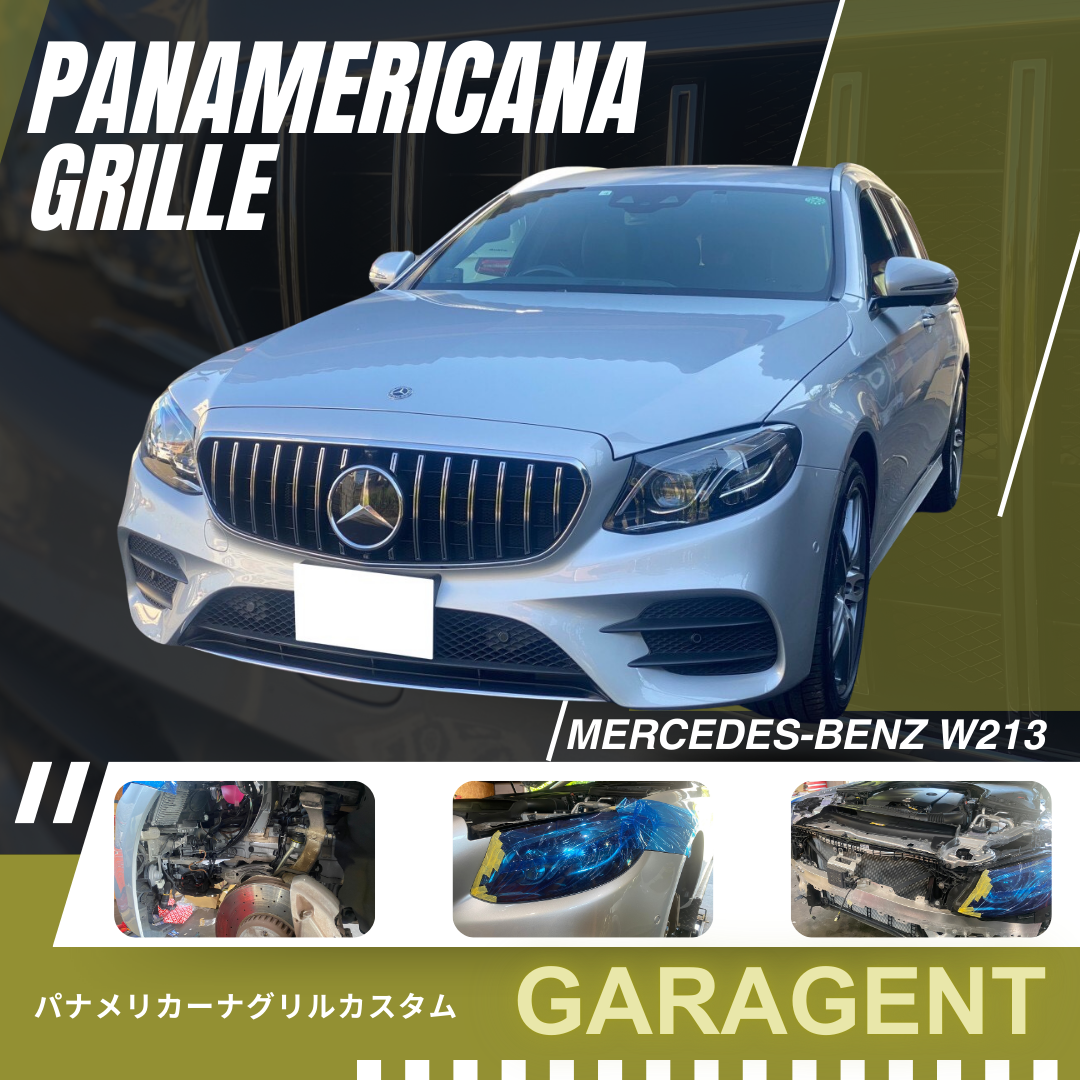 東京都中央区にお住いのN様より、メルセデスベンツ W213のパナメリカーナグリル交換をご依頼いただきました。今回のグリルは、車体に合わせて「ブラック×シルバー」のカラーを選択し、よりスタイリッシュな印象を狙います。さらに、メッシュグリルも同時に取り付けることで、見た目の向上とエンジンルームの保護も図ります。